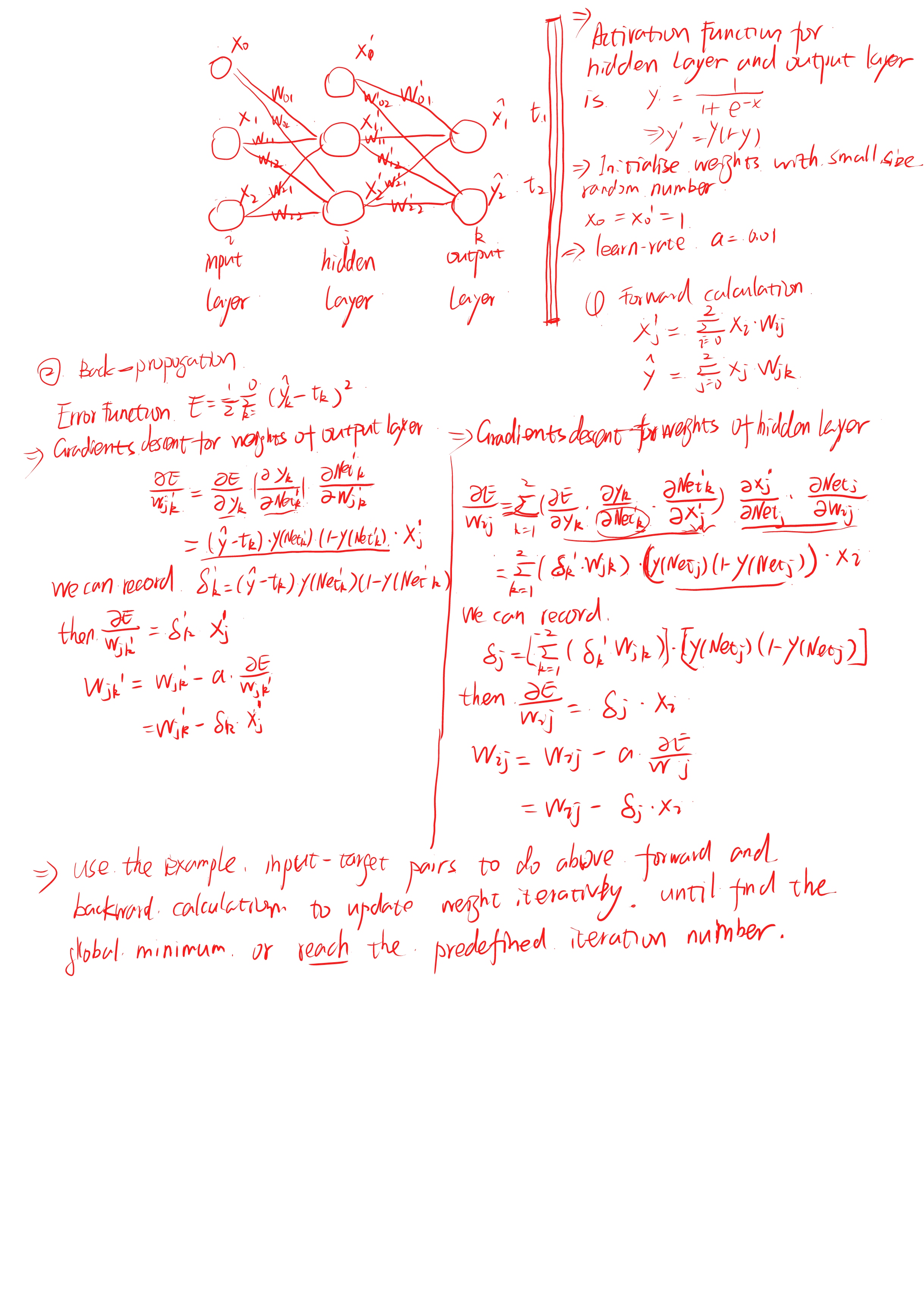 Backward to feedback the error between predict and target to weights, and update weights with the gradient of error function.